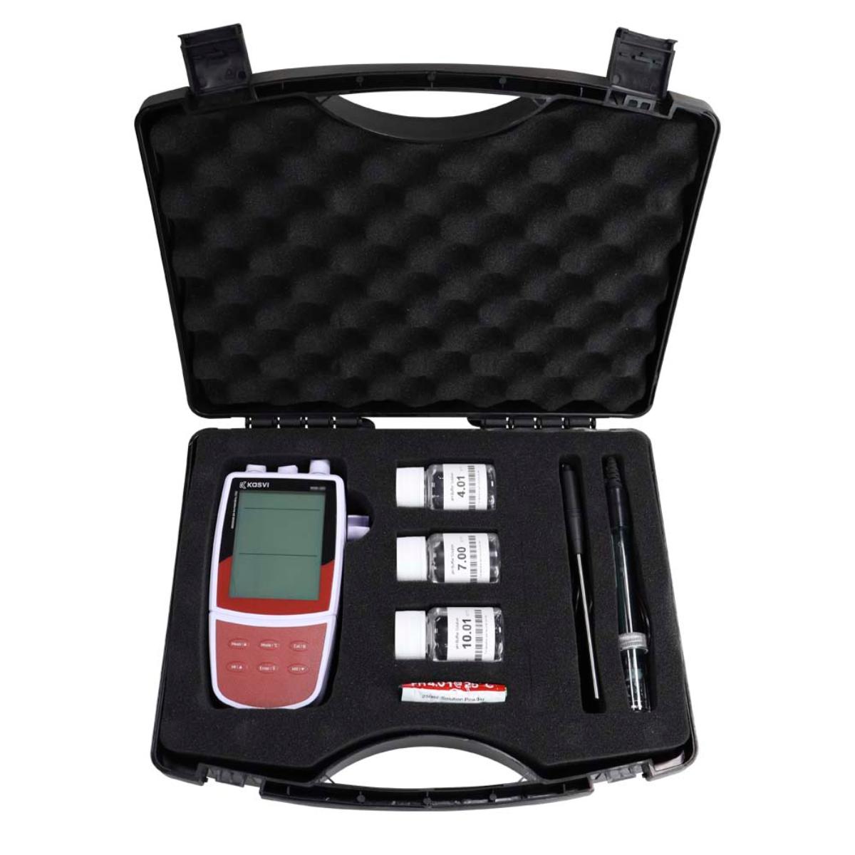 Medidor de pH portátil econômico com modo de medição mV, calibração de 1 a 3 pontos, compensação automática de temperatura, menu contém 7 opções de configurações, equipamento com precisão: ±0,01 pH e resolução: 0,01 pH.